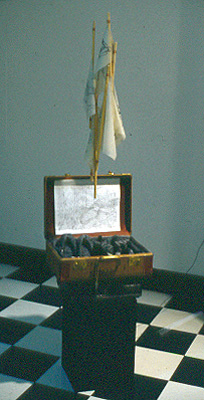 Kilauea, 2000-2002 Beeswax on women's accessories (makeup, shoes, nylons, curlers, jewelry, gloves, etc.) with video and topographical drawing in suitcase mounted on wall. 6 x 18 x 12"