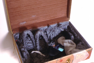 Beeswax on women's accessories (makeup, shoes, nylons, curlers, jewelry, gloves, etc.) with video in suitcase mounted on wall.